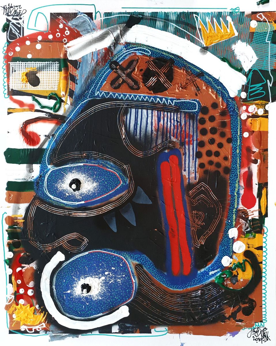 This piece was a big dispute between Thomas and Jacqueline. With Jacqueline being in a bad mood, the piece collected many layers over any non-satisfactory parts. But she couldn't be satisfied with anything that day, so in the end Thomas had enough of complaints and confiscated it into another room. Jacqueline saw Thomas fighting with the painting through the glass wall. Scraping, spraying, tearing and smearing textures in a sort of aggressive manner. She did not intervene until his energy had changed. In the end he added the "dead, white eyes" and exhaled hopelessly. Jacqueline stepped in the room. "I love it"